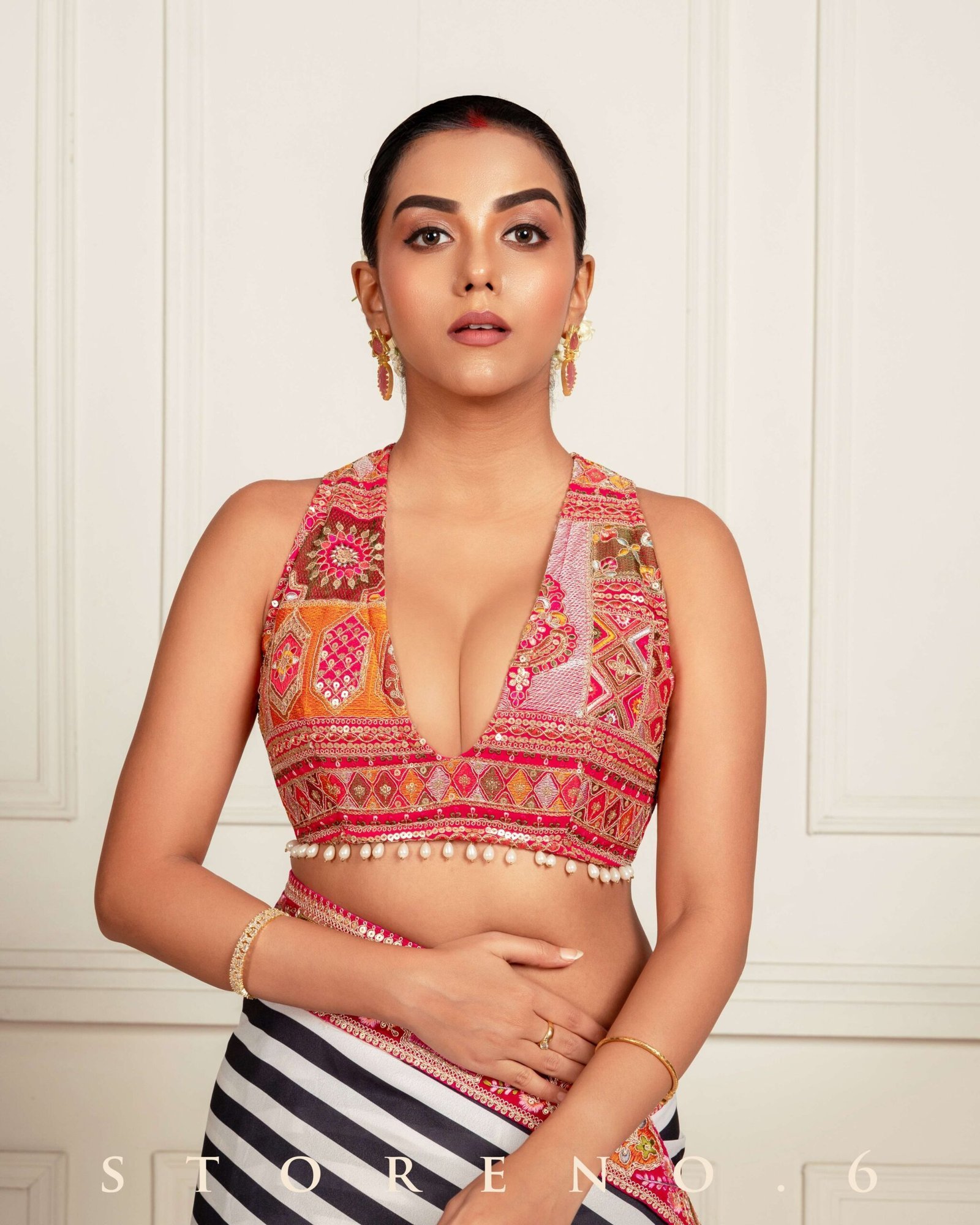 Description: Pink Georgette Embroidered Halter Blouse Embellished With Multicolored Thread, Golden Zari And Sequins Work Ends with Dangling Beads On Waist. Fabric Details: Georgette Embroidery Color: Pink Product Code: B25-PK82 Content: Blouse Care: Dry Clean Steam Iron Availability: Made to Order Others: Extra Customization Available (Chargeable).
