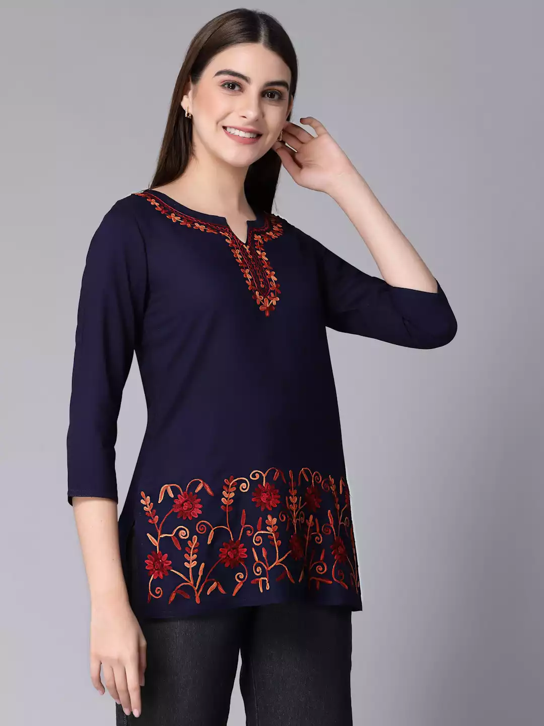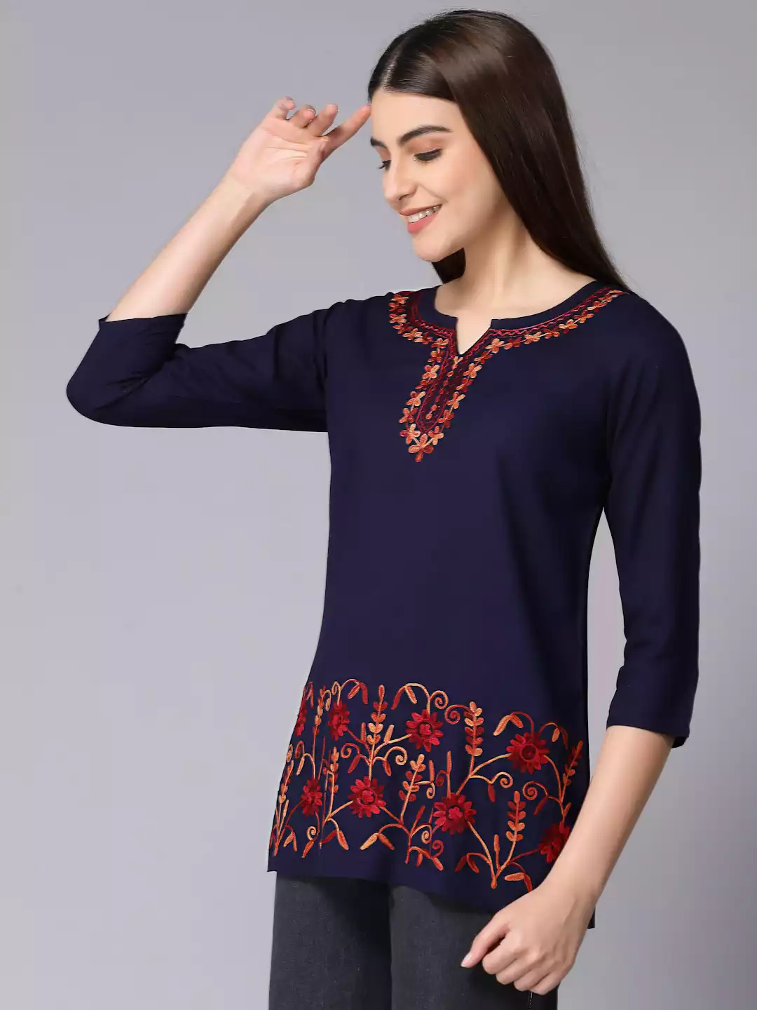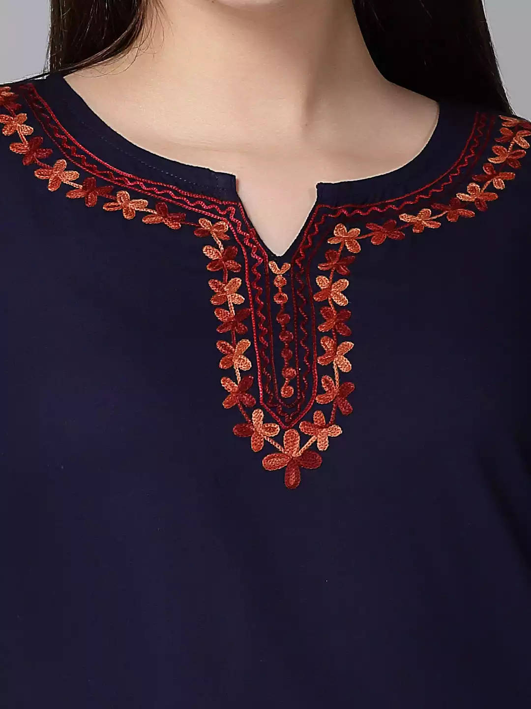 Color:Â Blue Kurti-type: Short Length: 26 Inches Sleeves: Three Quarter Sleeves Neck: Keyhole Neck Shape: Straight Fabric: Rayon Cotton Embroidery: Aari works using Multi-color Thread Wash care: Handwash Do not scrub the product and Dry it in the shade If it is naturally dyed, the colour might bleed slightly during the first few washes.