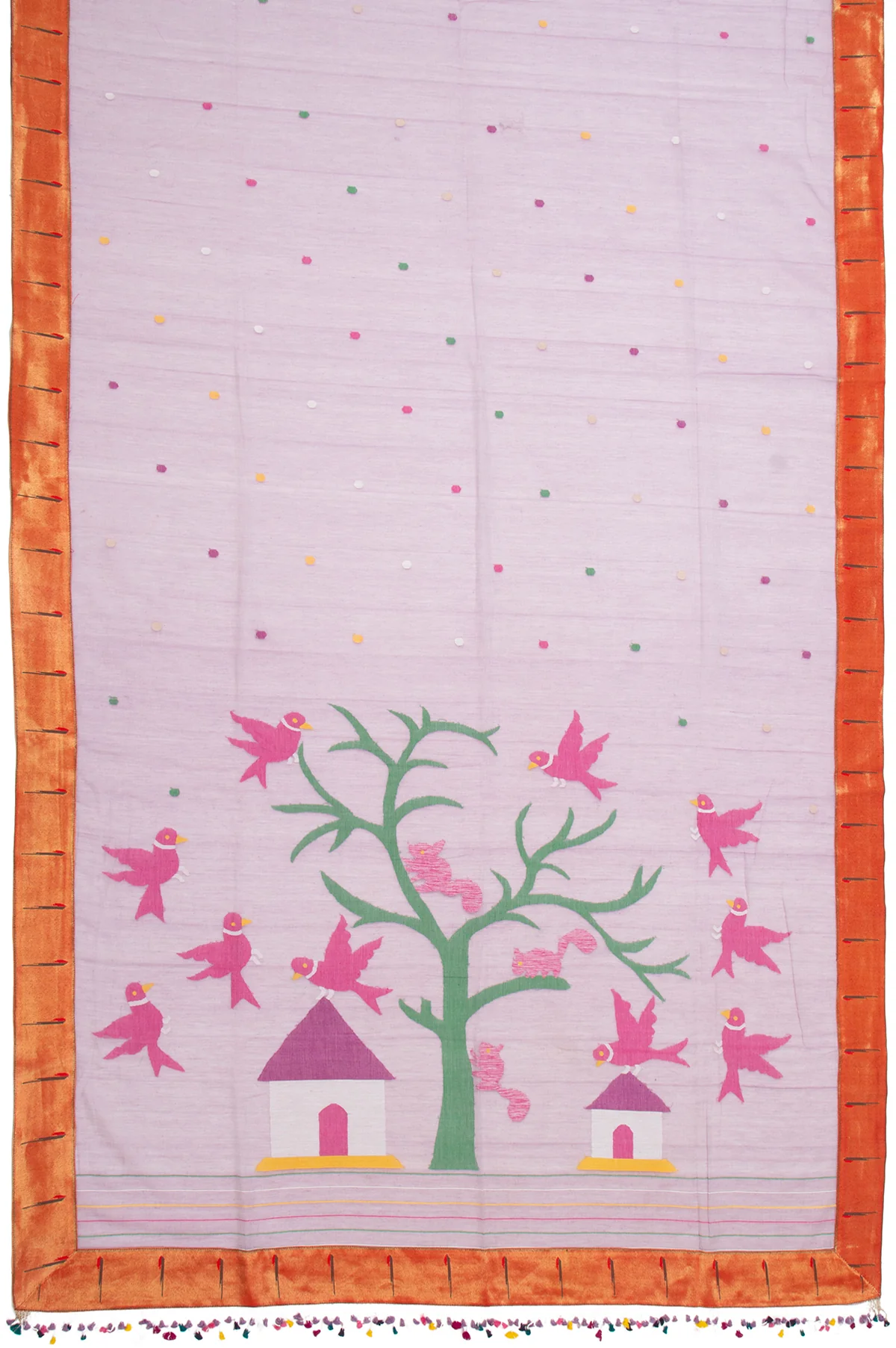 Make a bold statement with our Lavender Bengal Jamdani Saree. The sky blue plain border adds a pop of color. The self-colored pallu features Jamdani work, tree motifs, stripes, and tassels. The blouse comes with stripes and a border, and the body design is adorned with Jamdani work butta for a distinctive look.