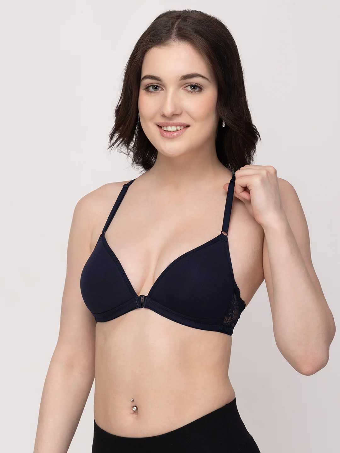 The Women’s Front-Open Bra T3037 combines comfort and style with its bralette design. Made from soft cotton, this lightly padded, non-wired bra provides medium coverage and a seamless finish, making it ideal for everyday wear