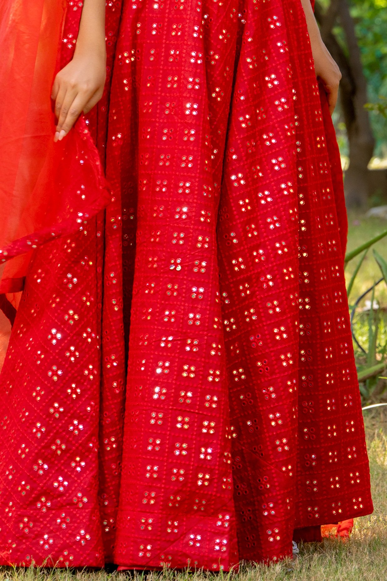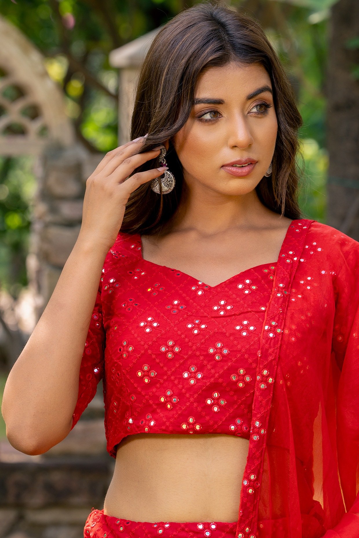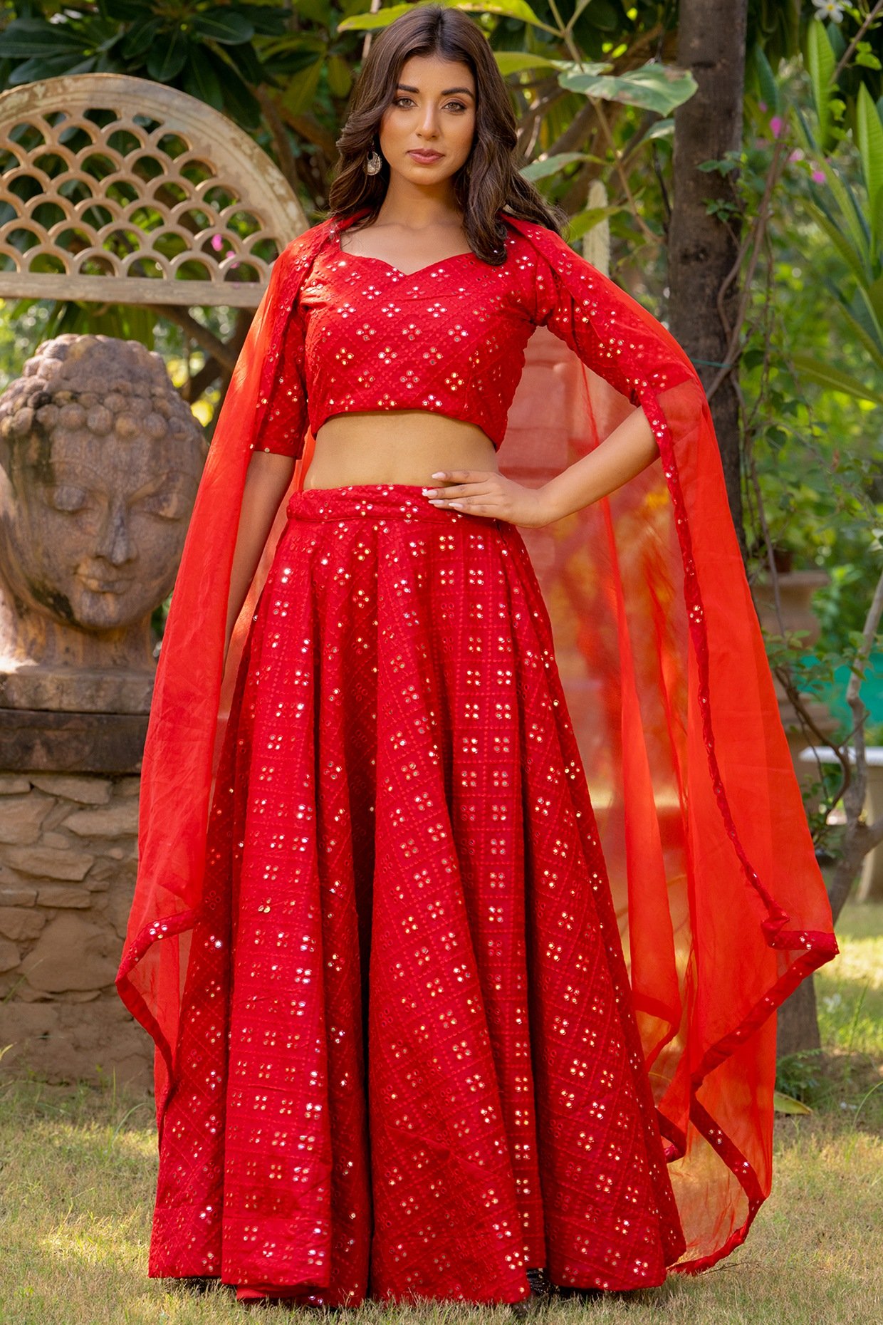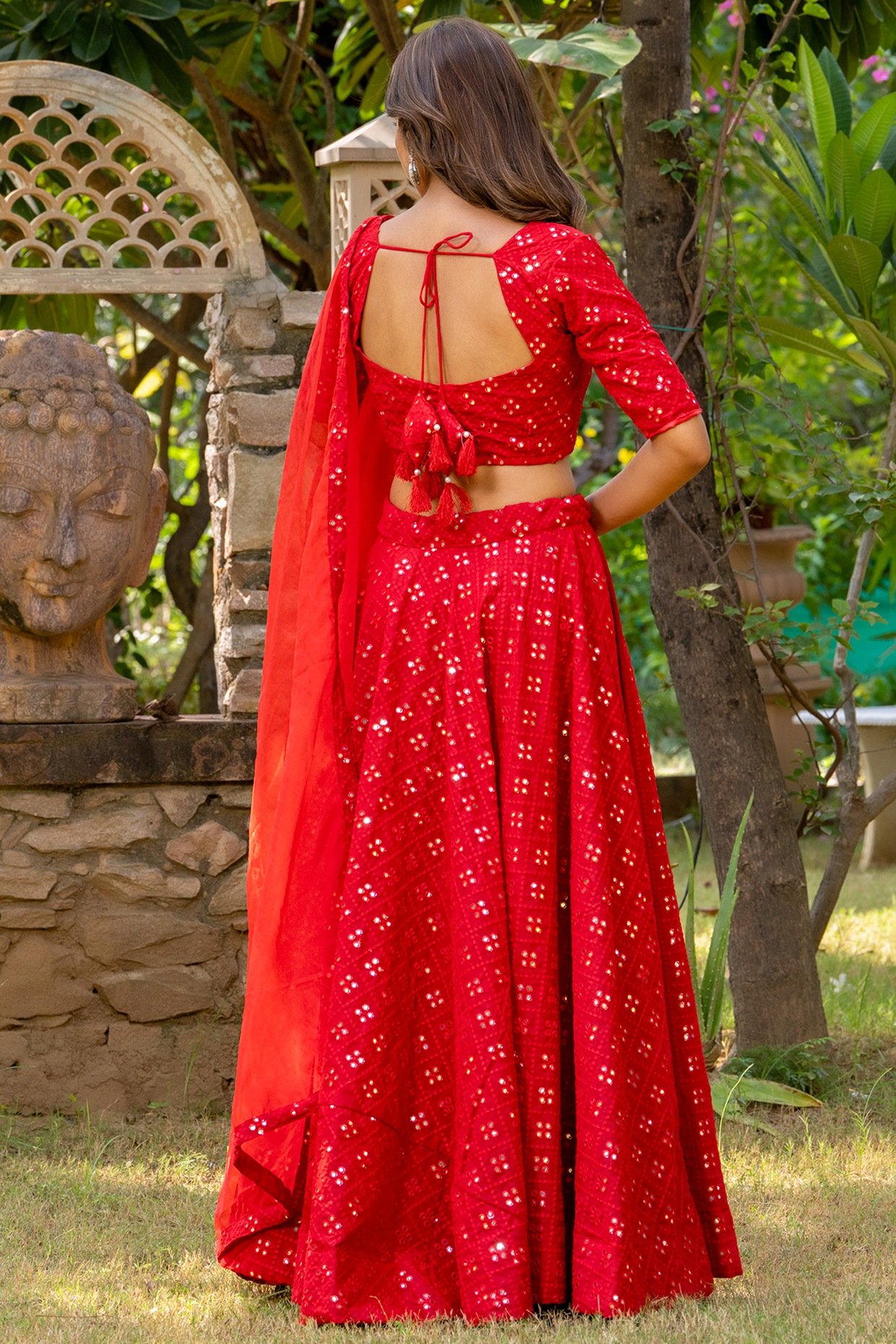 PRODUCT DESCRIPTION Featuring a red lehenga in georgette base with thread, mirror and tassels embroidery. It is paired with a blouse and an organza dupatta. Accentuate with chandbali earrings and heels for a wedding or sangeet ceremony.