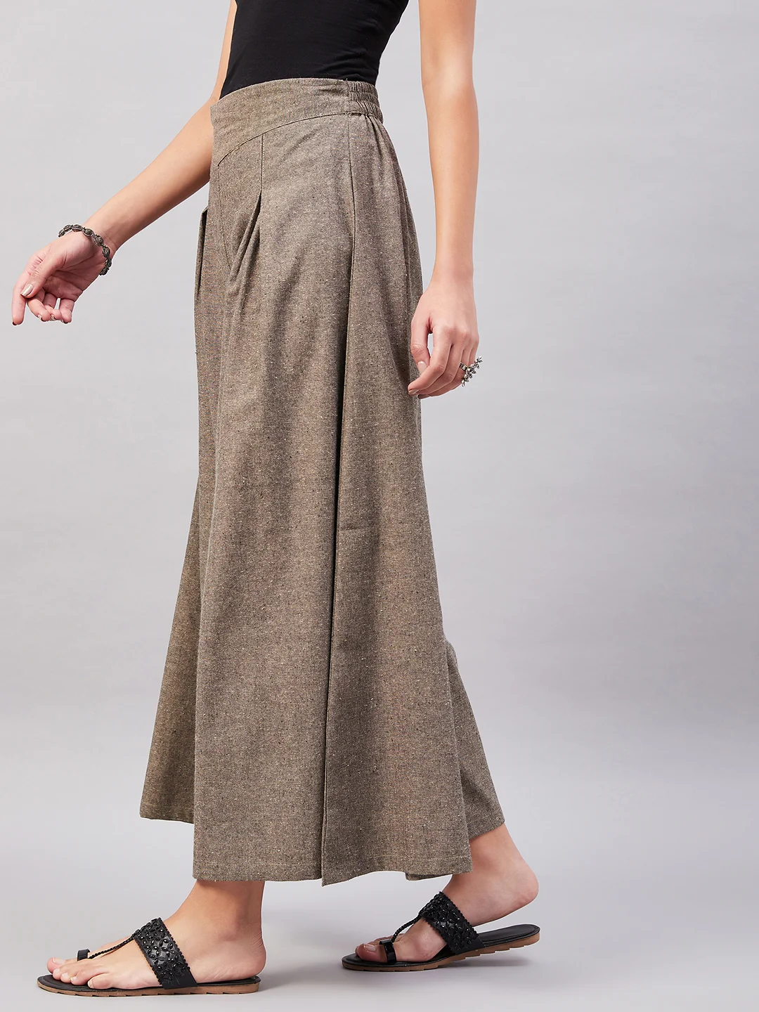 Embrace the spirit of summer with this pair of cool, gray-colored handloom palazzos. These cropped palazzos are made with original cotton fabric and showcase pretty front pleats.